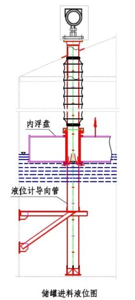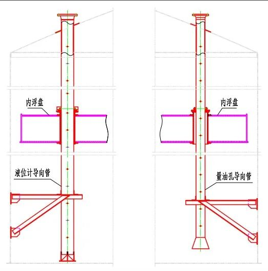 浮顶罐的量油孔、液位计管口下连接一根钢管穿过浮盘直插储罐底部,液位的测量通过该管进行,该管还具有有防止浮盘水平漂移和限止浮盘只能沿管道上下浮动等导向作用,故该管称为量油导向管、液位计导向管(下面简称导向管)。