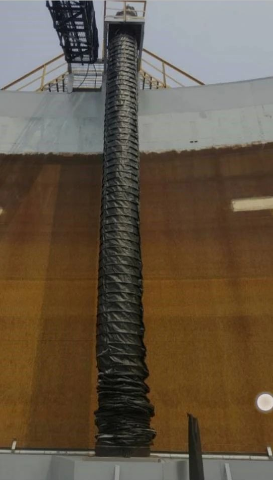 浮盘下降,浮盘上部的气相空间、囊套管和导向管内的气相空间都受到膨胀而压力压力下降(p1V1/T1=p2V2/T2,为了简化讨论,暂先不考虑温度变化)因浮盘上部的气相空间压力降到补氮设定压力可以补氮,因此压力不会一直下降而会稳定在补氮压力值。而囊套管和导向管内的气相空间没有补气口,随着浮盘下降,囊套管和导向管内的气相空间与浮盘上部的气相空间产生了压差,造成导向管内的浸液深度上升,液体被吸到囊套内,严重的能吸上去好几米。